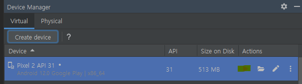 신규 Device를 생성합니다 > ReleasName S: (Android12, API Level31) 생성 및 실행