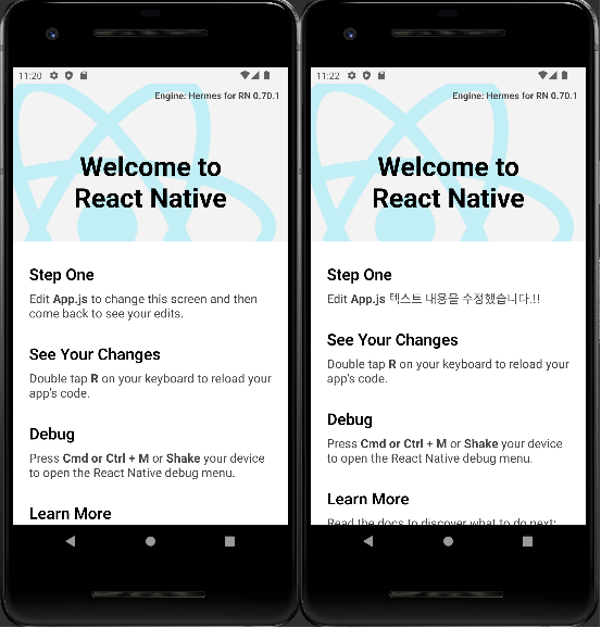 그러면 Emulator에 ReactNative 프로젝트 앱이 실행된 것을 확인할 수 있습니다.